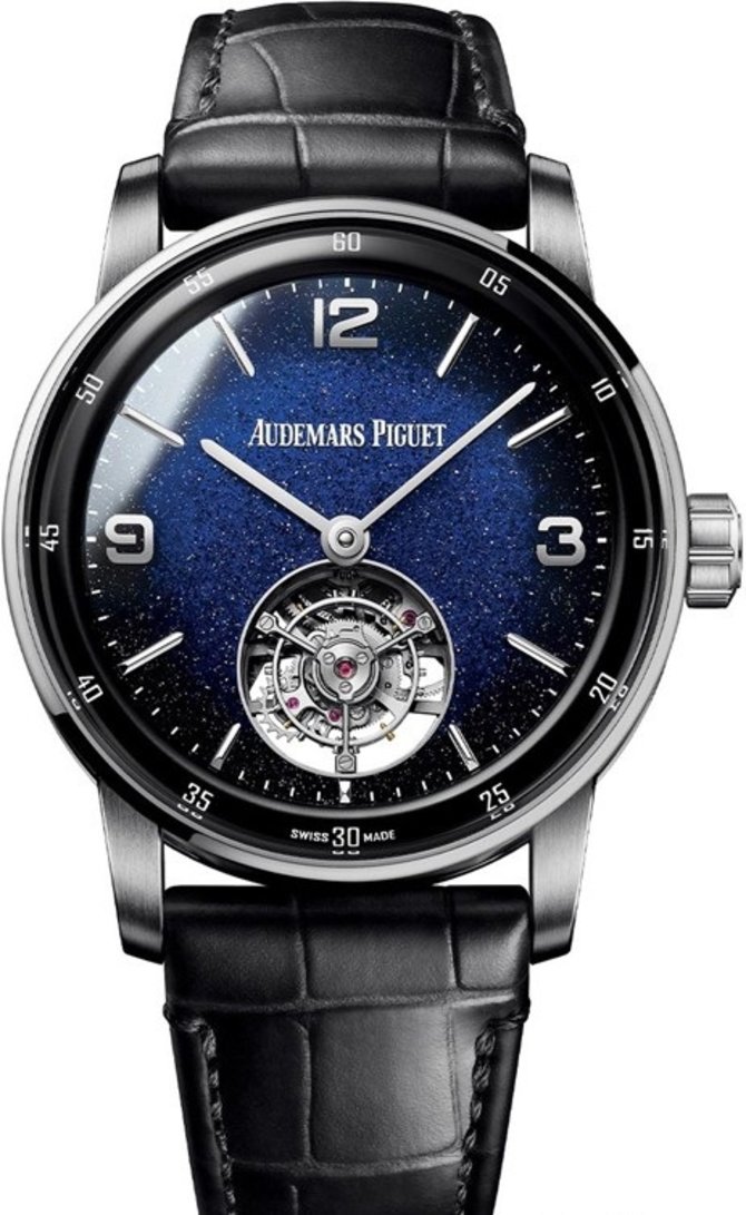 Модель Code 11.59 Selfwinding Flying Tourbillon 41 mm 26396BC.OO.D002CR.01 швейцарская часовая марка Audemars Piguet выпустила в корпусе круглой формы, выполненном из белого 18-каратного золота в диаметре 41 мм. Расположенный внутри этого корпуса мануфактурный механизм 2950 имеет возможность работать без подзавода на протяжении 65 часов. Он обеспечивает наручные часы такими функциями: часы, минуты. Циферблат синего цвета со стрелками и часовой разметкой из белого золота защищен надежным, высокопрочным и противобликовым стеклом из натурального сапфирового кристалла. Престижный производитель Audemars Piguet укомплектовал модель Code 11.59 Selfwinding Flying Tourbillon 41 mm 26396BC.OO.D002CR.01 ремнем из кожи аллигатора черного цвета, а также застежкой классического типа из белого золота. К тому же, модель отличается герметичностью корпуса, что гарантирует ему безопасное погружение на глубину до 30 метров. Также стоит отметить наличие функции турбийона, которая нивелирует влияние земной гравитации на точность хода механизма.