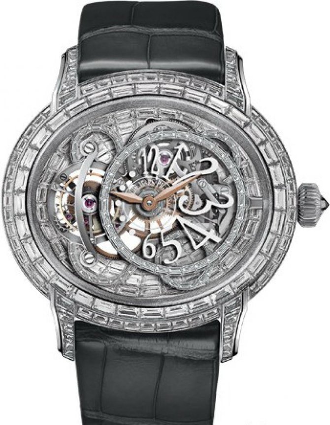 Мужские швейцарские наручные часы, обладающие сложной функцией турбийона, произведены из белого золота высшей пробы. Диаметр корпуса - 45 мм, а толщина - 11.7 мм. Максимальная водонепроницаемость корпуса - 20 метров. Механизм, находящийся внутри золотого корпуса, калибр 2940, с ручным подзаводом и запасом хода - 72 часа. Циферблат модели синего цвета, авантюриновый, скелетонизированный. Украшен белыми бриллиантами багетной огранки. Обеспечивает отображение часов и минут. Помимо корпуса, механизм защищают два сапфировых стекла. Первое расположено на лицевой стороне корпуса, с антибликовым покрытием. Второе - на задней части корпуса, благодяря которому можно наблюдать за работой механизма с ручным заводом 2940. Швейцарские часы укомплектованы ремнем, выполненным из кожи аллигатора, с ручной прошивкой, наделенным вставкой из белого золота в виде классической пряжки. Компания-производитель швейцарских часов Audemars Piguet основалась в 1875 году 23-х летним Жюль-Луи Одемаром и 21-летним Эдвардом-Аугустом Пиге. Дело всей своей жизни они начали маленькой деревне в Швейцарии, которая называлась La Vallee de Joux.