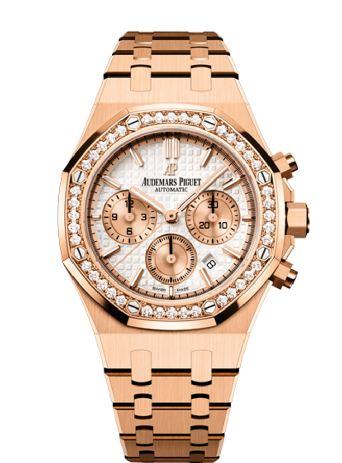 Швейцарский бренд Аudemars Рiguet выпустил ювелирную модель наручных часов с хронографом ROYAL OAK 26315OR.ZZ.1256OR.01 Chronograph в 38-миллиметровом корпусе, который выполнен из розового 18-каратного золота. Серебристый циферблат с узором «Grande Tapisserie» оснащен часовыми метками и стрелками для индикации времени с люминесцентным покрытием, индикатором даты, а также счетчиками хронографа из розового золота. Циферблат защищает сапфировое стекло с противобликовыми свойствами. Модель оснащена механизмом 2385 с автоподзаводом и функцией хронографа для измерения промежутков времени. На руке часы фиксируются браслетом из розового золота 750-й пробы и фирменной раскладной застежкой AP. Безель инкрустирован бриллиантами классической огранки. Водонепроницаемость корпуса рассчитана на 100 метров. Год выпуска модели - 2020.
