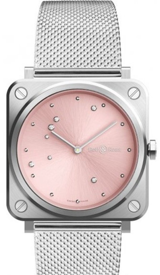 Швейцарская часовая компания Bell & Ross представила наручные часы Aviation BR S Diamond Eagle BRS-EP-ST/SST в стальном квадратном корпусе из нержавеющей стали, сатинированный циферблат розового цвета которых инкрустирован белыми бриллиантами классической огранки. Кварцевый часовой калибр BR-CAL.102 с помощью центральных стрелок из стали способствует индикации часов и минут. На руке владельца часы крепятся с помощью браслета из нержавеющей стали и раскладывающейся застежки. Корпус закреплен 4-мя винтами. Сапфировое стекло, установленное на лицевой части корпуса, покрыто антибликовым составом. Корпус отличается высокой водонепроницаемостью - до 100 метров.