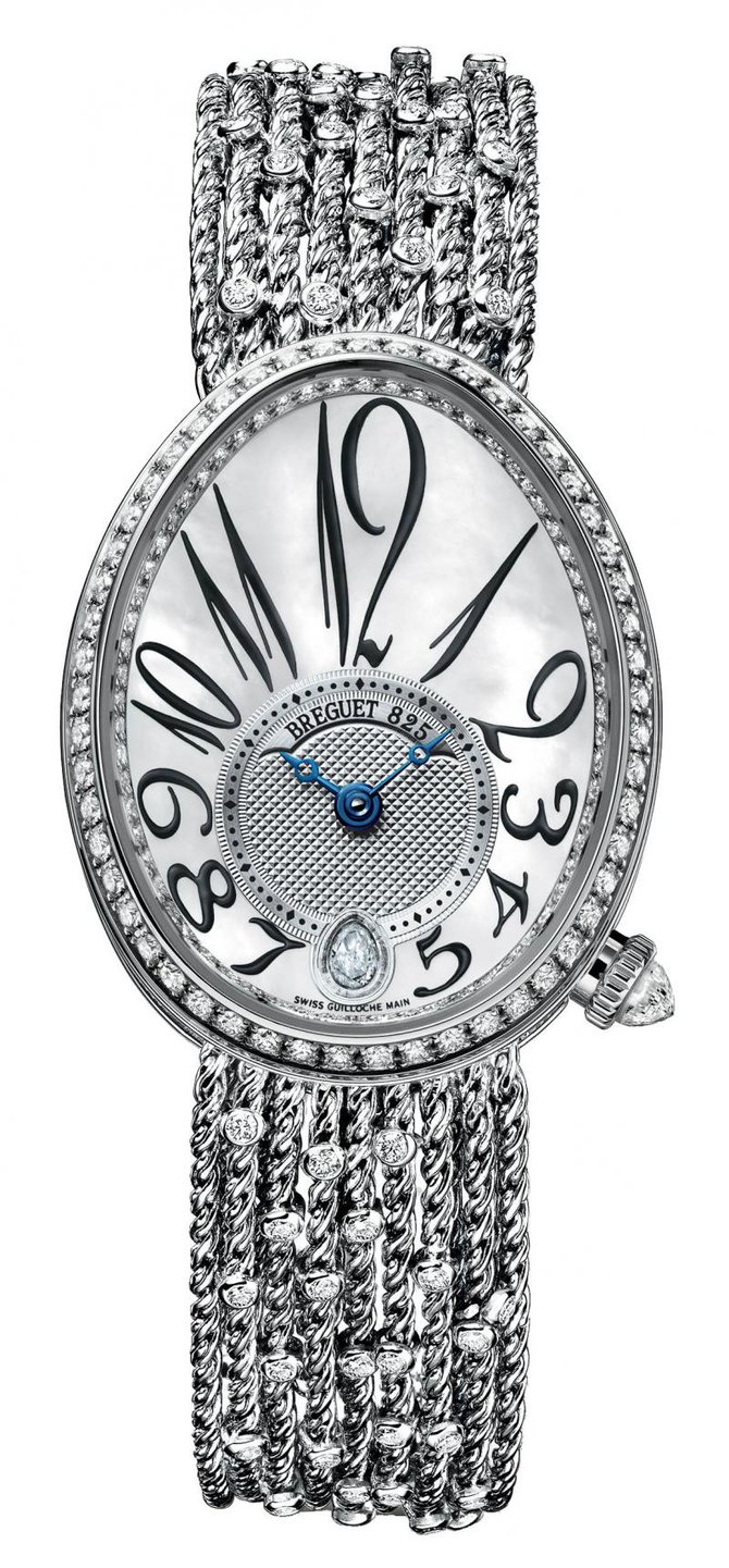 Очередная модель женских наручных часов 8918BB/58/J31 D0DD Reine de Naples Collection Collection от производителя Breguet не оставит к себе равнодушным ни одно женское сердце. Овальный корпус выполнен из белого 18-каратного желтого золота и имеет такие параметры: 28.45 x 36.5 x 10.05 мм. Боковая сторона корпуса украшена неглубоким рифленем, что характерно для стиля Breguet. Заводная головка инкрустирована белым бриллиантом 0.26 ct. Циферблат сделан из цельной пластины белого золота. На белом циферблате великолепно смотрится посеребренный узор гильоше, который сделан вручную при помощи гильоширной машинки. Стрелки отлиты вручную из вороненной стали, и украшены "яблоками" Breguet. Механизм оснащен калибром 537/1 и имеет запас хода на 40 часов. Водонепроницаемость модели составляет 100 футов, что равняется 30 метрам. Безель украшен 117-ю белыми бриллиантами 0.99 ct. Ремешок сделан из белого 18-каратного золота инкрустированный белыми бриллиантами