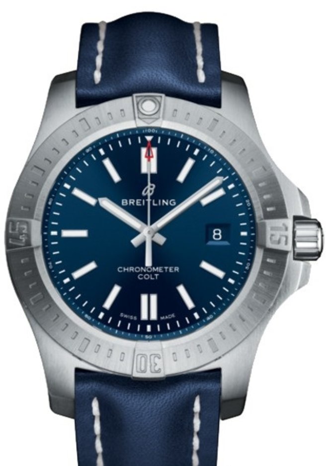 Компания из Швейцарии по производству люкс-часов Breitling представила модель Chronomat Colt Automatic 44 в круглом корпусе, размером 44 мм х 11.25 мм, выполненном из нержавеющей стали. На безель корпуса нанесена гравировка в виде минутной шкалы. Водонепроницаемость корпуса рассчитана на погружение часов под воду до 200-метровой глубины. Установленный в часах автоматический механизм обладает запасом хода на 38 часов работы без подзавода. Калибр мануфактурной сборки Breitling 17 имеет сертификат сверхточного хронометра COSC. На синем циферблате показываются данные часов, минут, секунд и даты. Часовые метки и стрелки из стали покрыты люминесцентным составом белого цвета. В комплекте идет кожаный ремень из кожи теленка синего цвета с застежкой классического типа из из нержавеющей стали.