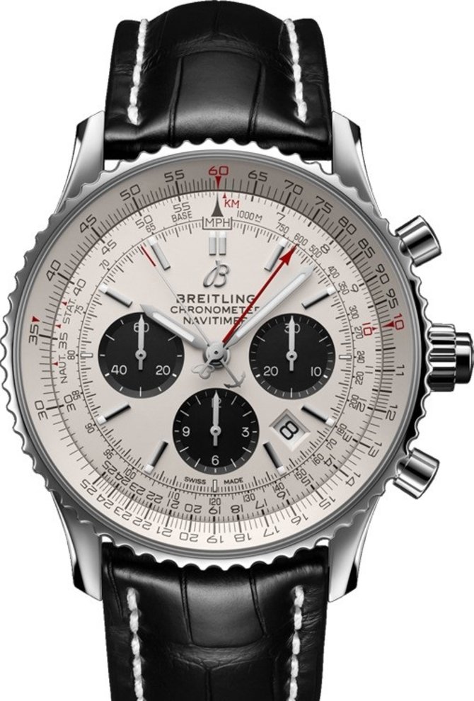 Компания Breitling в 2020 году выпустила мужскую модель швейцарских часов со статусом хронометра Navitimer 1 B03 Chronograph Rattrapante 45 AB0311211G1P2. Часы выпущены в круглом корпусе из нержавеющей стали и керамики, размером 42 мм. Автоматический калибр Breitling 10 способен проработать без подзавода на протяжении 42 часов. Циферблат накрыт стеклом из натурального сапфирового кристалла с противобликовыми свойствами. Стрелки и часовая разметка для индикации времени покрыты люминесцентным составом, который светится в темноте. Модель поставляется с матерчатым ремнем и классической застежкой из стали. Водонепроницаемость корпуса - 100 метров. Безель вращается.