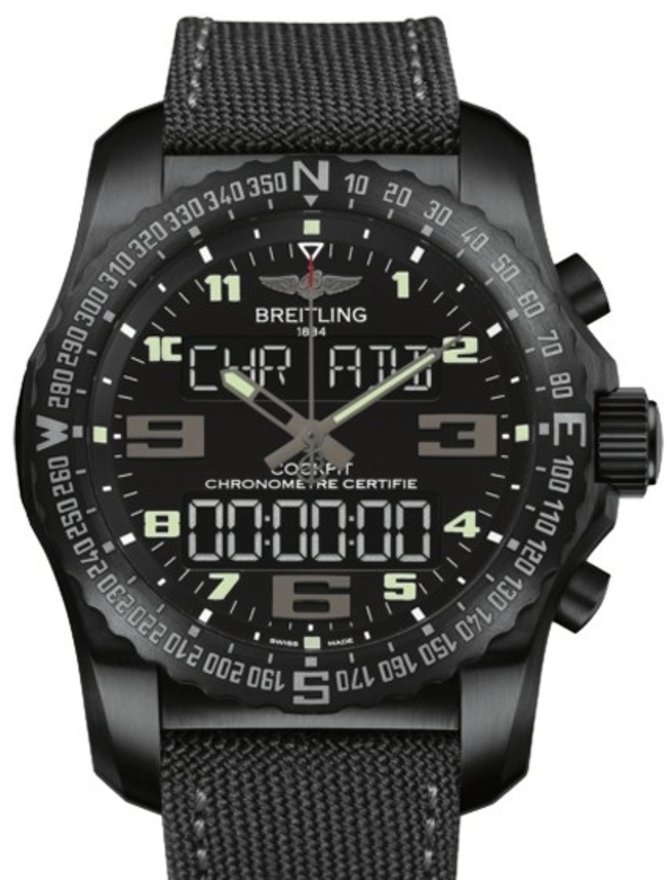 Кварцевые швейцарские часы от знаменитой швейцарской мануфактуры Breitling, модель Professional Cockpit B50 VB501022/BD41/100W/M20BASA.1, работают на базе кварцевого механизма с будильником, вечным календарем, хронографом, индикацией времени двух часовых поясов, даты, дней недели, цикла високосного года и др. На безель нанесена тахиметрическая шкала. Крупный титановый корпус, размером 46 х 16.45 мм, крепится на руке матерчатым ремешком из нейлона и классической пряжкой из титана. Циферблат оснащен подсветкой. Стекло из сапфирового кристалла накрывает аналогово-электронный циферблат от повреждений. Корпус имеет 100-метровый уровень герметичности.