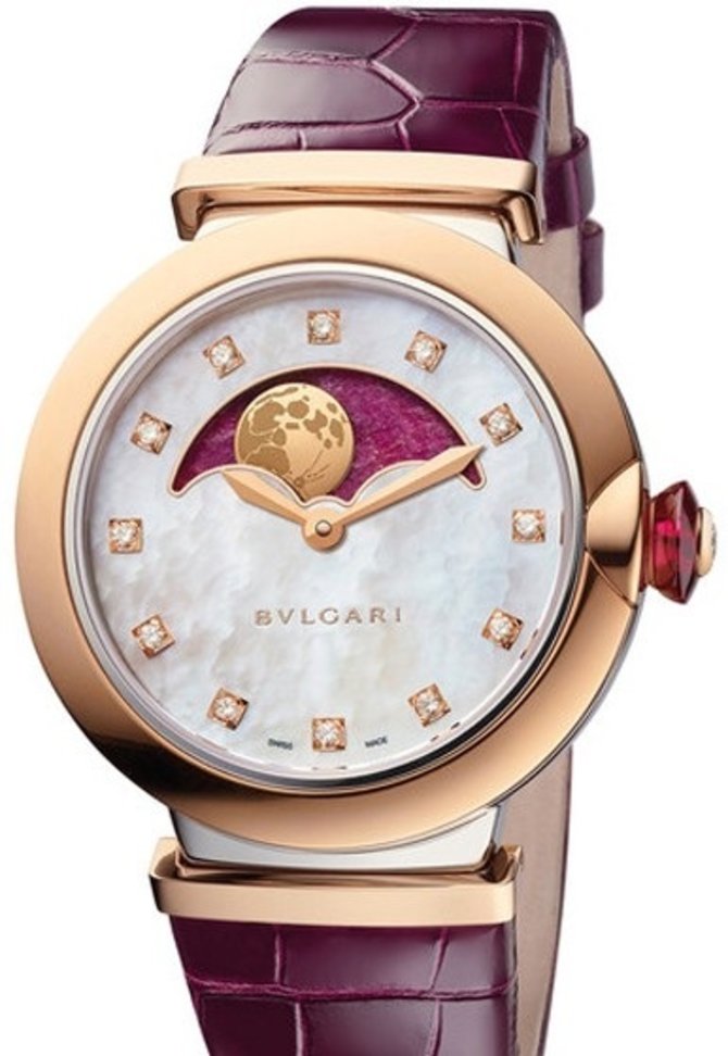 Женские швейцарские часы Bvlgari Lvcea Moon Phases 102695. Несмотря на то, что LVCEA сохраняют свою чистую красоту, индикатор лунных фаз придает дополнительную сложность циферблату, который опирается на часовое усложнение, чтобы подчеркнуть романтический характер этой модели. В тонкой манере небо, на котором появляется луна, приобретает оттенок, соответствующий оттенку ремешка из кожи аллигатора. Данная модель выпущена в трех вариантах: стальная версия с безелем из розового золота, перламутровый циферблат, пунктированный блестящими ограненными алмазными часовыми метками; более сложная интерпретация розового золота 18 карат с его ремешками и безелем с классическими бриллиантами; или вариация из белого золота, украшенная рамкой с классическими бриллиантами. Общее впечатление - это бесшовный осмос, любовный матч между «светлыми» часами и «ночной звездой».