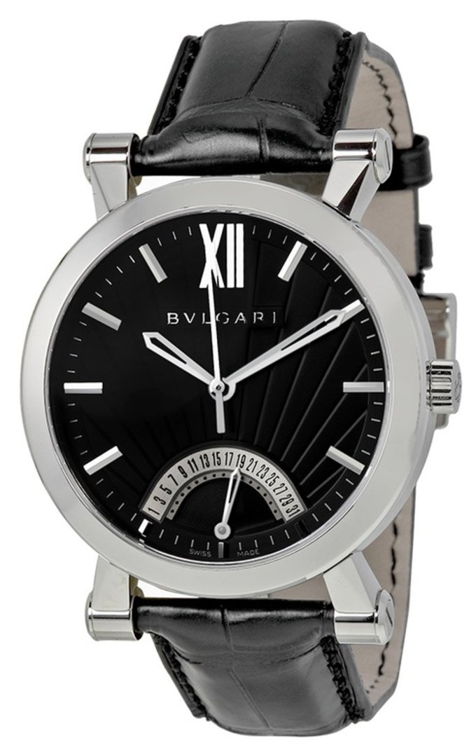 Известный бренд Bvlgarii представляет вашему вниманию элегантные швейцарские часы модели Retrograde Date. Данная модель мужских часов изготовлена из нержавеющей стали, солидно сочетаясь с черным ремешком. Ремешок изготовлен из кожи аллигатора. Он фиксируется на руке классической застежкой, изготовленной также из нержавеющей стали. Корпус круглой формы, диаметром 42 миллиметра. Функции модели Retrograde Date стандартные: часы, минуты, секунды, дата. Но индикатор даты ретроградный - представлен в нижней части циферблата в виде дуги. Запас хода - 42 часа. Циферблат черный гильошированный с классическими часовыми метками и римской цифрой 12. Водонепроницаемость часов - 30 м.