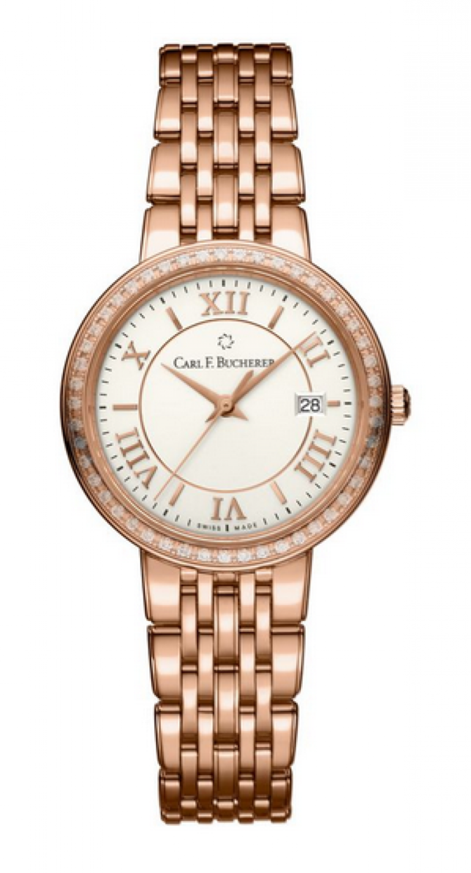 Корпус часов из розового золота представленной модели инкрустирован белыми бриллиантами классической огранки. Механизм, от которого функционируют часы, кварцевый. На циферблате с золотыми метками и стрелками индицируются часы, минуты и секунды, а также дата. Лицевая и задняя части корпуса защищены сапфировым стеклом. Водонепроницаемость часов - до 30 метров. Компанию Carl F. Bucherer отличают такие ценности, как экспертный опыт в изготовлении часов, технические инновации и преемственность. Благодаря линейке Adamavi, данный бренд швейцарских часов получил коллекцию, которая символизирует ощущение неподвластного времени дизайна и уникальный подход: стремление сохранить проверенное временем качество. Кристаллы кварца движутся за счет энергии батареи, которая, в зависимости от хода, служит от двух до трех лет. В это время на точность часов не влияет разрядка батареи. В часах с секундной стрелкой имеется индикатор разрядки: если батарея почти разрядилась, то секундная стрелка перемещается с пятисекундным интервалом. Батарею необходимо заменить в течение двух недель в авторизованном сервисном центре.