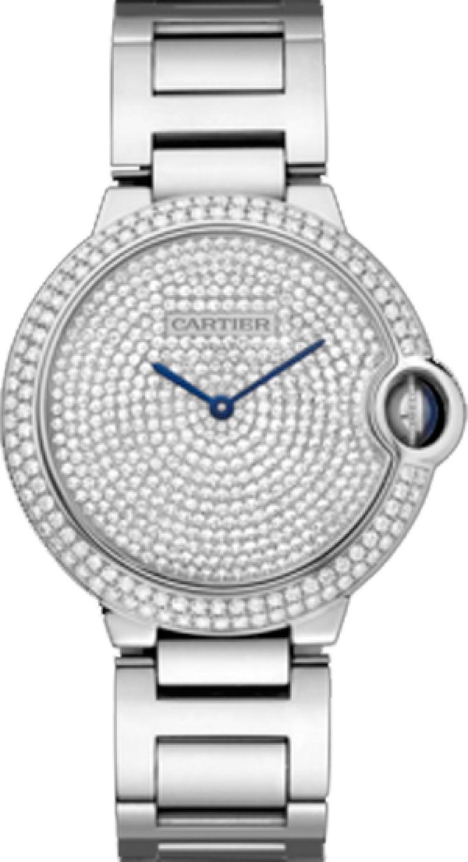 Представляем вашему вниманию, очередную модель женских наручных часов от всемирно известного французского производителя часов и ювелирных изделий Cartier. Название модели Ballon Bleu de Cartier Automatic 36 mm WE902045 которые находятся в коллекции "Ballon Bleu de Cartier". Сразу хотелось сказать, что часы заинтересуют как и любительниц исключительно женственных дизайнов, так и любительниц надежных простых устройств. Корпус выполнен в форме круга, отполирован до блеска, сделан из белого восемнадцати-каратного золота, и имеет такие размеры: 36 х 12.1 мм. Основные функции модели это часы, минуты. Автоматический механизм часов оснащен калибром Cartier 076. Циферблат полностью покрыт белыми бриллиантами, что несомненно придется по вкусу любительницам драгоценностей. Браслет часов выполнен из белого золота как и весь корпус, оснащен откидной вставкой. На циферблате находятся стрелки, которые отлиты вручную из вороненной стали. И что касается водонепроницаемости, она более стандартна и составляет тридцать метров. Заводной ключ инкрустирован синим кабошоном. Корпус закрывает прочное стекло выполненное из сапфира. Задняя крышка часов закрыта под давлением.
