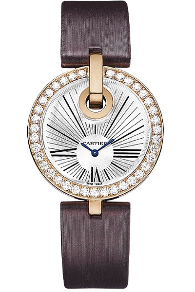 Представляем вашему вниманию, очередную модель женских наручных часов от всемирно известного французского производителя часов и ювелирных изделий Cartier. Название модели Captive de Cartier Large WG600011 которые находятся в коллекции "Captive de Cartier". Сразу хотелось сказать, что часы заинтересуют как и любительниц исключительно женственных, необычных дизайнов, так и любительниц надежных простых устройств. Корпус выполнен в форме круга, отполирован до блеска, сделан из розового восемнадцати-каратного золота, и имеет такие размеры: 35 x 9.33 мм. Основные функции модели это часы, минуты. Кварцевый механизм часов оснащен калибром Cartier 056. Циферблат серебристого цвета, гильошированный. Ремешок часов баклажанового цвета, выполнен из такого материала как атлас, оснащен золотой вставкой также откидной застежкой. На циферблате находятся стрелки, которые отлиты вручную из вороненной стали. И что касается водонепроницаемости, она более стандартна и составляет тридцать метров. Корпус закрывает прочное стекло выполненное из сапфира. Задняя крышка часов закрыта под давлением. Безель украшен белыми бриллиантами, что несомненно оценят любительницы драгоценностей.