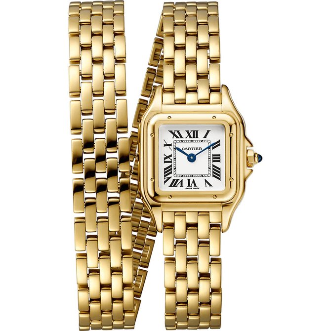Знаменитый швейцарский часовой бренд Cartier в 2023 году пополнил коллекцию Panthere de Cartier новинкой - моделью швейцарских кварцевых часов для женщин - Small WGPN0039. Квадратный корпус выполнен из полированного 18-каратного желтого золота. Внутри корпуса инженерами компании Cartier установлен кварцевый механизм мануфактурной разработки. На запястье руки часы фиксируются золотым браслетом с раскладной застежкой. Сквозь стекло из сапфирового кристалла с антибликовым покрытием на белом циферблате показываются данные текущего времени. Стрелки выполнены из вороненой стали. Водонепроницаемость золотого корпуса - 30 метров.
