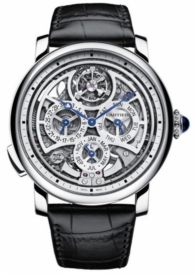 Перед Вами удивительная модель швейцарских часов Cartier, вошедшая в коллекцию бренда "ROTONDE DE CARTIER". Удивительная, в первую очередь, своим функциональным набором: часы, минуты, вечный календарь, день, дата, месяц, фазы Луны, цикл високосного года, репетир, турбийон. Многовато, как для одних часов, не правда ли? Круглый корпус модели изготовлен из дорогого металла - платины. Его диаметр - 45 мм; толщина - 12.6 мм. Циферблат с индикацией широкого подбора функций защищает сапфировое стекло. Заводная головка со вставкой сапфира-кабошона синего цвета. Механизм автоматический, производство мануфактуры Cartier. Ремешок черного цвета пошит мастером вручную из натуральной кожи аллигатора. Застежка раскладная; выполнена из белого золота. Корпус с 30-метровой герметичностью.