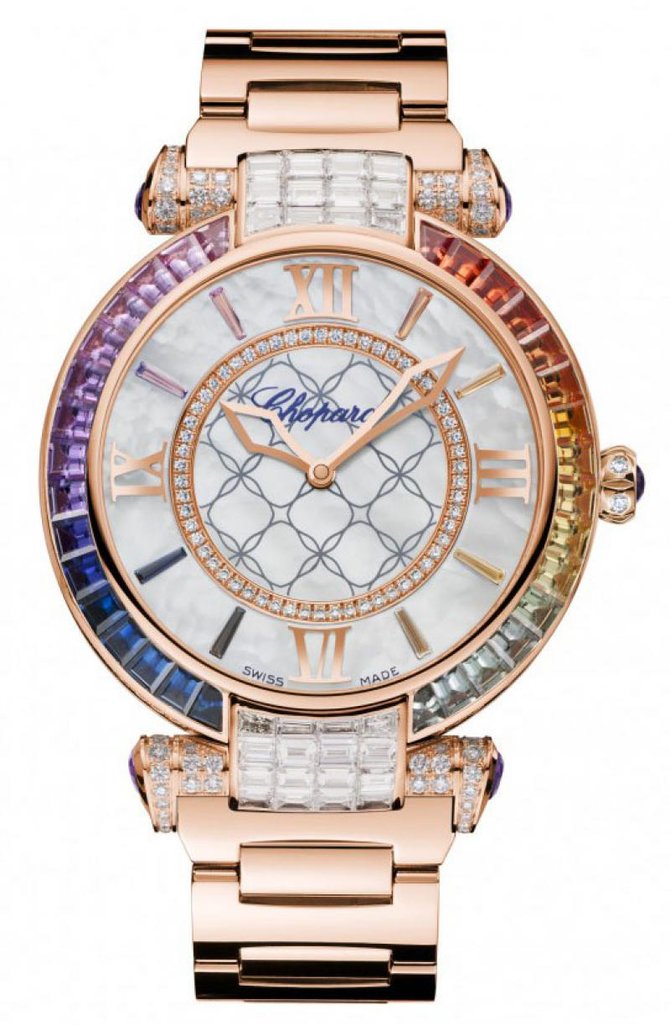 Корпус инкрустирован белыми бриллиантами круглой и багетной огранки, безель из багетных сапфиров. Chopard – изысканный стиль и безупречный вкус, часовщикам это было бы обидно. Но тем не менее это так. Точность, сложность, оригинальность узлов – у механизмов Chopard все это есть. Но у других бывает и лучше. Престижная марка, но кто из серьезных швейцарцев не престижен? Зато во всем, что касается красоты, Chopard великолепен. Особенно если учесть, что эта красота придумана специально для мужчин. Мужчины, как известно, консервативны. Отсюда ставка на традиционный дизайн.Компания Chopard занимается производством швейцарских часов класса люкс, ювелирных украшений и аксессуаров с 1860 года, когда Луи Улисс Шопар (Louis-Ulysse Chopard), открыл мастерскую в швейцарском городке Сонвийе. Он сделал ставку на повышение точности карманных часов и хронометров, используя новейшие идеи своего времени, и не прогадал. Вскоре его часы, заслужившие превосходную репутацию своей точностью и надежностью, получили признание вдали от дома - в Западной Европе, России и Скандинавии.