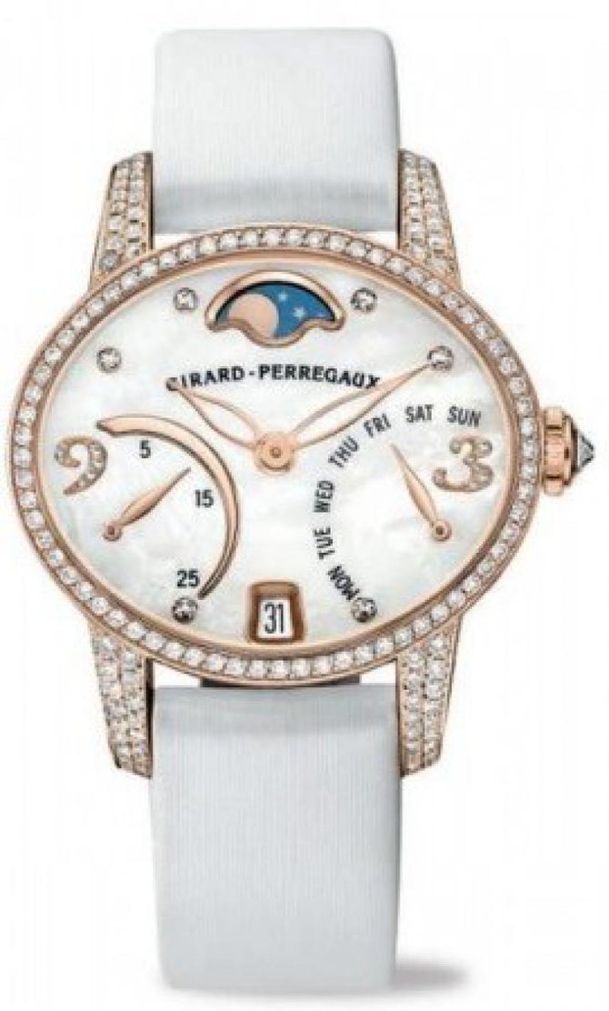 Элегантные женские швейцарские часы Girard-Perregaux Cat`s Eye представлены женскому обществу в изящной комбинации золотого корпуса и атласного браслета с золотой вставкой, механизм часов автоматический; особенности модели - водостойкие, безель из белых бриллиантов 0.85 ct, на циферблате также размещены белые бриллианты, заводной ключ инкрустирован черным ониксом кабошоном; запас хода - 48 часов. На сегодняшний день швейцарские часы Girard Perregaux – особенное сочетание дизайна моделей и механизмов. Girard Perregaux предназначены не для всех, а для истинных ценителей, которые четко осознают, чем является качество, традиции и стиль. Бренд Girard Perregaux обладает столетним опытом в часовой индустрии. Быстро, после создания, компания Girard Perregaux стала популярной, выпустив в жизнь наручные часы с плоским корпусом. Издавна, да и по сей день все детали швейцарских часов Girard Perregaux скрупулезно проверяются на всех этапах сборки. Большинство моделей часов Girard Perregaux персонализированы, они изготовлены для истинных ценителей высокой часовой моды. Неоспоримый факт, что Girard Perregaux умеет справляться с трудностями на своем пути. История бренда, обильная занимательными фактами и значимыми событиями, насчитывает больше 200 лет. Будущее у итальянского предпринимателя, любителя парусного спорта, ярого автомобилиста и собирателя раритетных хронометров, которого звали Луиджи Макалузо, было сомнительное, когда он решил взяться за спасение утопающей мануфактуры Girard-Perregaux из Ла Шо-де-Фона.