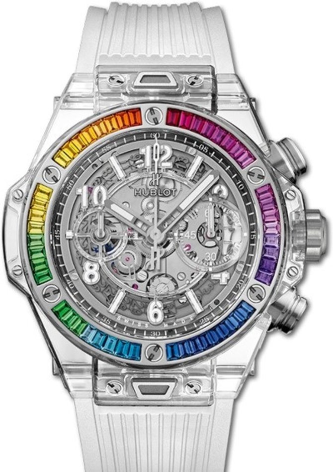 Модель мужских часов от компании Hublot - Big Bang Unico Chronograph 42 mm 441.JX.4802.RT.4099 выполнена в корпусе круглой формы из сапфирового стекла. Диаметр корпуса - 42 мм. Часы отличаются наличием функции хронографа и скелетонированным циферблатом, что защищен сапфировым стеклом с антибликовым составом. Кроме того, автоматический механизм HUB1280 гарантирует индикацию текущего времени и даты. Стрелки и арабские цифры заполнены светящимся в темноте люминесцентным составом. Ремешок состоит из каучука белого цвета. В комплекте с ним идет титановая застежка. Запас хода механизма дает возможность часам функционировать без подзавода на протяжении 72 часов. Корпус герметичен на уровне 50 метров. Безель из разноцветных багетных сапфиров. Часы выпущены в 2020 году.
