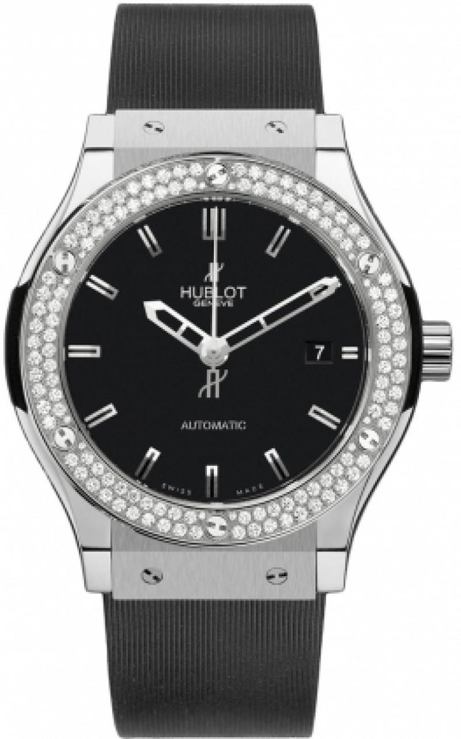 Очередная великолепная модель мужских наручных часов Fusion Zirconium 511.ZX.1170.RX.1104 от производителя Hublot не оставит к себе никого равнодушным, потому как завораживает своим внешним классическим видом и функциональностью. Круглый корпус выполнен из прочного циркония, и имеет такие размеры: 45 мм в диаметре. Автоматический механизм данной модели оснащен калибром HUB 1112, и имеет запас хода на 40 часов. Прочные сапфировые стекла, устойчивые к царапинам и другим повреждениям закрывают корпус с обеих сторон. Апертура с датой находится на позиции 3 часа. На черном циферблате шикарно смотрятся отлитые вручную посеребренные стрелки. Водонепроницаемость модели составляет 100 футов, что равняется 30 метрам. Черный каучуковый ремешок оснащен циркониевой вставкой и откидной застежкой. Любители бриллиантов не пройдут мимо этой модели, так как корпус инкрустирован 194-мя белыми бриллиантами 1.6 ct., а безель украшают 126 белых багетных бриллиантов.