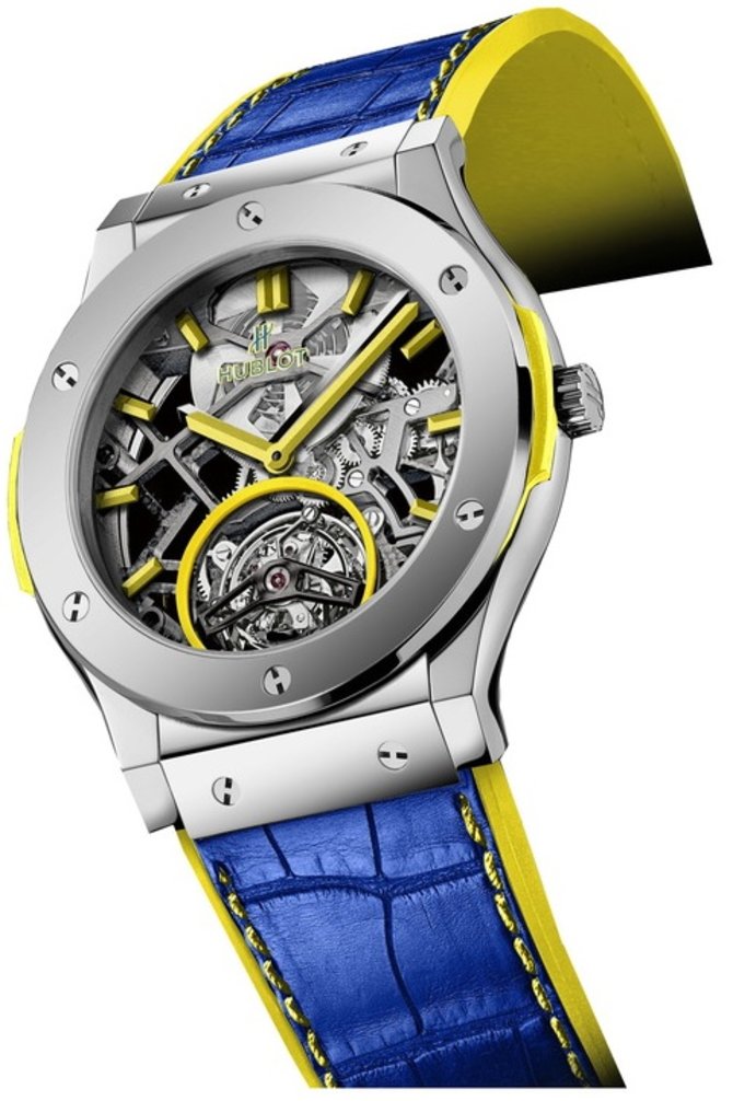 Представленная модель швейцарских наручных часов с турбийоном выпущена компанией Hublot в честь известного бразильского теннисиста Густаво Куэртена (Guga Kuerten). Густаво стал лицом бренда Hublot в 2013 году, присоединившись к таким мировым спортивным знаменитостям, как Усэйн Болт, Пеле, Дуэйн Уэйд и Кобе Брайант. Часы функционируют на швейцарском мануфактурном калибре HUB6010 с функцией турбийона, который работает от ручного подзавода. Он состоит из 155 элементов, где 19 - драгоценные камни. Балансовая частота механизма - 3 Гц (21,600 пк/час); 120-часовой запас хода. Корпус с двух сторон закрыт сапфировым стеклом с внутренним и внешним антибликовым покрытием соответственно. На задней крышке оставлен автограф теннисиста. Герметичность корпуса - 30 метров. Ушки корпуса, часовые метки и стрелки вскрыты лаком. Застежка из нержавеющей стали, раскладывающаяся.
