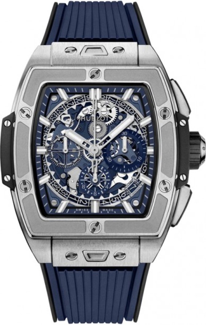 Корпус швейцарских часов Hublot Spirit of Big Bang Chronograph 42 mm 642.NX.7170.RX выполнен из титана в форме бочки, диаметром 48 х 42 мм. Внутри него установлен автоматический калибр HUB4700 с запасом хода на 50 часов, а также со спортивной функцией хронографа. Циферблат, где показываются часы, минуты, секунды, дата, хронограф, накрыт стеклом из сапфирового кристалла. Стрелки и часовые метки заполнены люминесцентным составом. Для фиксации часов на руке в комплекте поставляется ремень из каучука. Водонепроницаемость корпуса рассчитана на 100 метров. Безель фиксируется титановыми винтами в форме буквы Н.