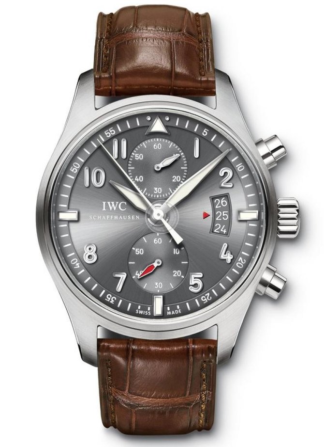 Компания IWC, известная во всем мире, представляет очередные великолепные часы IWC Pilot`s Watche Spitfire Chronograph IW387802 из коллекции Pilot`s Watches. Очень сложно пройти мимо данной модели и не обратить на неё внимания, так как часы привлекают внешним видом и многофункциональностью. Одна из главных особенностей данной модели это повышенна водостойкость, наличие хронографа. Круглый корпус часов выполнен из нержавеющей стали. Параметры корпуса: 43 x 15.5 мм. На сером циферблате великолепно смотрятся посеребренные отлитые вручную из вороненной стали стрелки. Прочное сапфировое стекло закрывает циферблат. Задняя крышка закрыта под давлением. Ремешок выполнен из кожи аллигатора, коричневого цвета, оснащен раскладывающейся застежкой а также вставкой из нержавеющей стали. Водонепроницаемость модели составляет 60 метров.