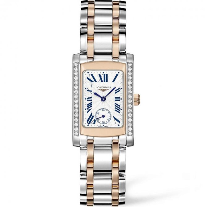 С момента своего выхода в свет в 1997 году коллекция Longines DolceVita неизменно пользовалась огромным успехом, благодаря своей утонченной современной элегантности. Эти модели напоминают об удовольствиях итальянского стиля жизни - dolce vita. Безупречно гармоничные пропорции прямоугольного корпуса моделей этой коллекции – их уникальная характеристика. Завоевывая сердца женщин по всему миру, модели коллекции выполнены из стали или желтого золота, или в комбинации стали и розового золота, а некоторые модели украшены бриллиантами. Эти часы представлены в корпусе прямоугольной формы из нержавеющей стали и розового золота 18 карат, который украшают 32 бриллианта группы Top Wesselton VVS общим весом 0,269 карата. Имеют сапфировое стекло, устойчивое к царапинам. Водонепроницаемость данной модели до 3 бар(30 метров). Оснащены кварцевым механизмом калибра L178. Браслет выполнен из нержавеющей стали, имеет вставки из розового золота 18 карат. Застежка тройная - с системой блокировки и кнопкой.
