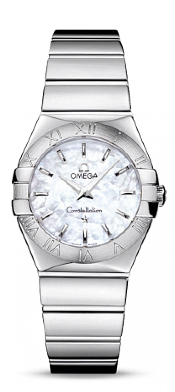 В этих часах используется высокоточный кварцевый часовой механизм с родиевым покрытием OMEGA, калибр 1376. Запас хода часов весьма внушительный - 41 месяц. Превосходный дизайн часов OMEGA Constellation прошел проверку временем. Особенностью модельного ряда стали скобки по бокам часового корпуса и циферблаты. Эта полированная модель имеет белый перламутровый циферблат. Циферблат накрыт очень прочным, устойчивым к царапинам сапфировым стеклом с антибликовым покрытием изнутри. Часы водостойкие и выдерживают погружение в воду на глубину до 100 метров. Корпус диаметром 27 мм из нержавеющей стали. Безель с выгравированными римскими цифрами. Часы дополняет браслет из нержавеющей стали.