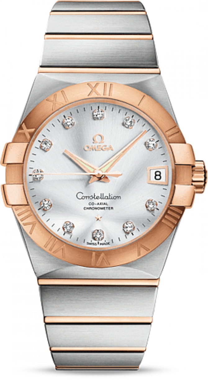 В этих изысканных часах используется коаксиальный часовой механизм OMEGA, калибр 8500, который виден сквозь прозрачную заднюю крышку корпуса. Корпус диаметром 38 мм из нержавеющей стали, который дополнен браслетом из нержавеющей стали и 18-каратного розового золота. Эта модель имеет серебристый циферблат с окошком указателя даты в положении «3 часа» и устойчивым к царапинам сапфировым стеклом с антибликовым покрытием изнутри. Часовые отметки выполнены из бриллиантов. Безель из 18-каратного розового золота с выгравированными римскими цифрами закреплен. Часы герметичны и выдерживают давление в 10 бар (эквивалент глубины 100 метров). Запас хода - 60 часов.