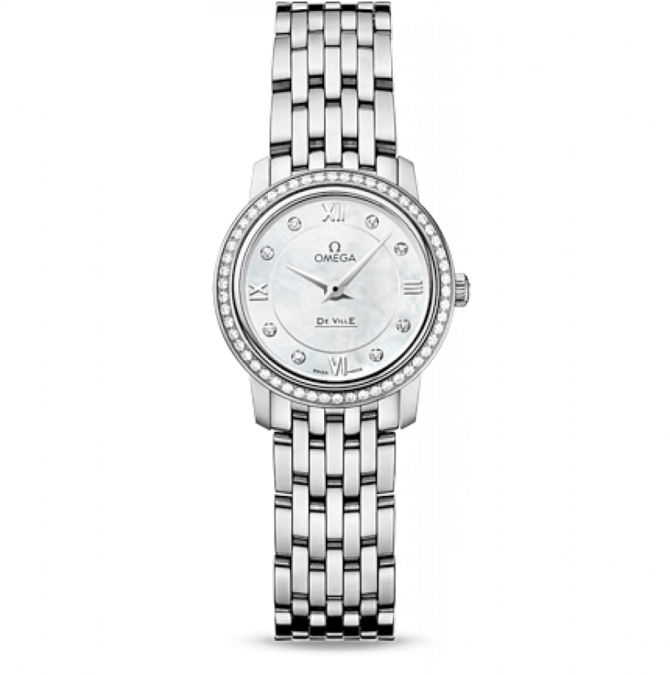 OMEGA De Ville Prestige завоевала любовь поклонников бренда своим классическим элегантным дизайном. Входящие в нее модели отличаются чистотой линий, роскошной отделкой и вневременным дизайном. Эффектный циферблат защищен устойчивым к царапинам сапфировым стеклом. Данная модель имеет белый перламутровый циферблат с делением на две зоны, с бриллиантовыми часовыми метками и выполненными из золота римскими цифрами в положениях «3 часа», «6 часов», «9 часов» и «12 часов». В этой модели используется высокоточный кварцевый механизм OMEGA, калибр 1376. Корпус диаметром 24,4 мм из нержавеющей стали с браслетом из того же материала дополнен украшенным бриллиантами безелем из стали. Часы сохраняют свою водонепроницаемость на глубине до 30 метров. Запас хода часового механизма данной модели часов весьма внушительный - 41 месяц.