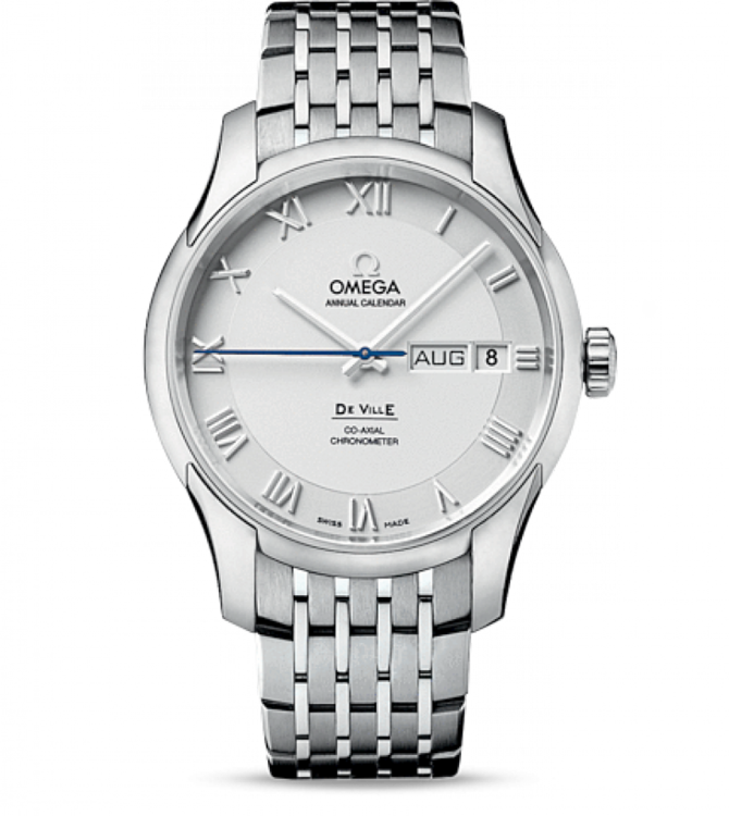 Каждая из моделей серии OMEGA De Ville характеризуется оригинальным классическим дизайном. Корпус диаметром 41 мм из нержавеющей стали с браслетом из того же материала дополнен элегантным безелем. В этой изысканной модели используется коаксиальный механизм OMEGA, калибр 8611, который очень хорошо виден сквозь прозрачную заднюю крышку. Запас хода часового механизма этой модели составляет 55 часов. Данная модель имеет серебристый циферблат с делением на две зоны, римскими цифрами окошками указателей даты и месяца в положении «3 часа». Эффектный циферблат защищен устойчивым к царапинам сапфировым стеклом с двусторонним антибликовым покрытием. Часы герметичны и сохраняют свою водонепроницаемость на глубине до 100 метров.
