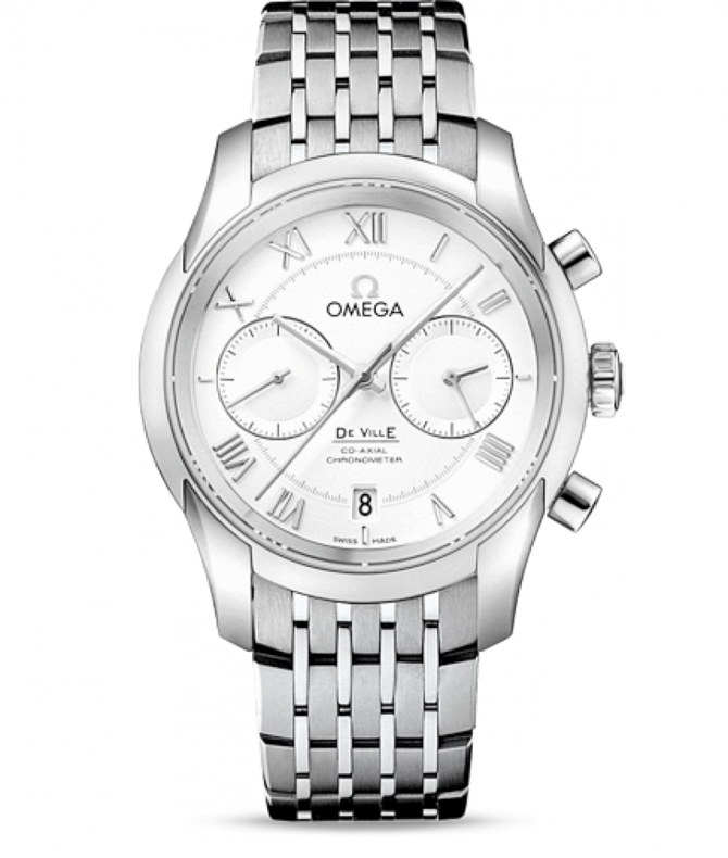 Элегантные часы OMEGA De Ville характеризуются уникальным классическим дизайном. Циферблат надежно защищен устойчивым к царапинам сапфировым стеклом с двусторонним антибликовым покрытием. Хронограф имеет серебристый циферблат с делением на две зоны, римскими цифрами, окошком указателя даты в положении «6 часов». На циферблате присутствуют отдельный индикатор малой секундной стрелки, а также 60-минутный и 12-часовой счетчики, размещенные на одном индикаторе для более удобного считывания результатов хронометража. Корпус диаметром 42 мм из нержавеющей стали с стальным ремешком дополнен элегантным безелем. Часы сохраняют свою водонепроницаемость на глубине до 100 метров. В этой изысканной модели используется коаксиальный механизм OMEGA, калибр 9301, который виден сквозь прозрачную заднюю крышку корпуса. Запас хода механизма данной модели составляет 60 часов.