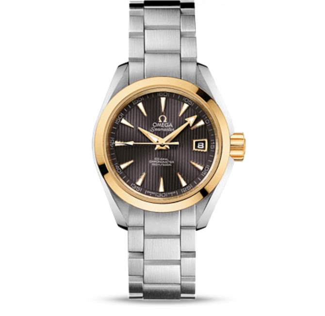 Эффектный, мгновенно узнаваемый дизайн циферблата, характерный для коллекции OMEGA Seamaster Aqua Terra 150M, напоминает текстуру тикового покрытия роскошных яхт. Оригинальный циферблат защищен устойчивым к царапинам сапфировым стеклом с двусторонним антибликовым покрытием. Данная модель имеет коричневый циферблат, оформленный в стиле фирменной «тиковой концепции», с окошком указателя даты в положении «3 часа». Корпус диаметром 30 мм из нержавеющей стали с браслетом из нержавеющей стали дополнен безелем из 18-каратного желтого золота. В этом сертифицированном хронометре используется коаксиальный часовой механизм OMEGA, калибр 8520, который хорошо виден через прозрачную заднюю крышку. Запас хода данного механизма - 50 часов. Часы водонепроницаемы и способны выдержать давление на глубине до 150 метров.