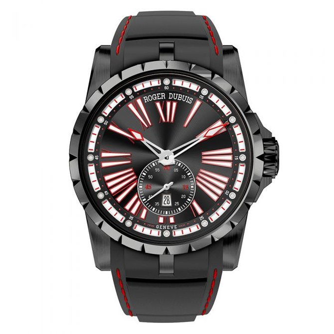 45-миллиметровый часовой корпус Roger Dubuis Excalibur Essential 45 RDDBEX0567 произведен из титана с черным покрытием DLC - алмазоподобного покрытия для повышения срока службы корпуса. Внутри корпуса находится механизм, разработанный специалистами компании Roger Dubuis в стенах собственной мануфактуры. Калибр RD830 работает от автоматического подзавода, за работу которого отвечает золотой ротор. Запас хода механизма доходит до 2 суток. Ремешок черного цвета сделан из каучука и прошит красной нитью, которая подчеркивает другие красные элементы дизайна модели. Также в красную окантовку взяты римские цифры и стрелки, которые залиты люминесцентным составом.