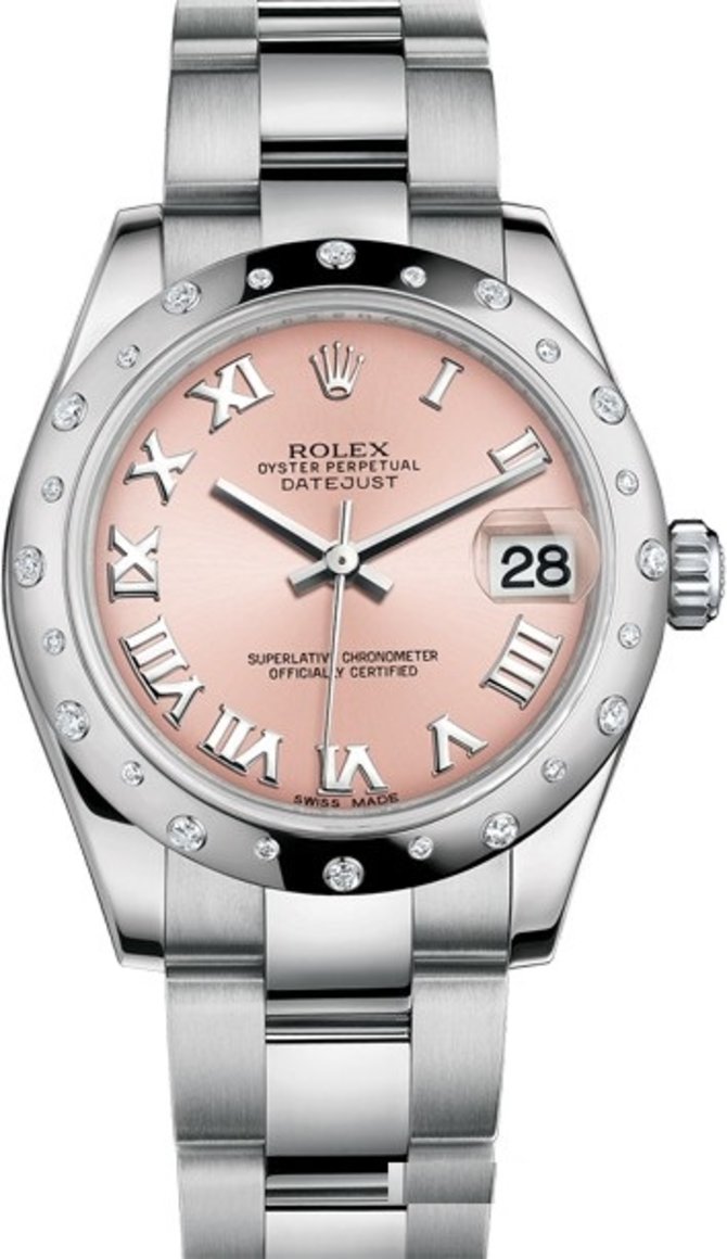 Женские швейцарские механические часы с элегантным дизайном и ненавязчивой инкрустацией драгоценными камнями - белыми бриллиантами. Корпус, браслет, раскладная застежка, римские цифры и стрелки циферблата - из белого золота. Диаметр корпуса - 31 мм. Нежно-розовый циферблат защищен сапфировым стеклом. Окошко, служащее для отображения даты, увеличивает показания - фирменный стиль Rolex Datejust. Установленный в бело-золотом корпусе автоматический мануфактурный механизм имеет сертификат хронометра, которым отметил калибр швейцарский институт хронометрии COSC. Корпус отличается высокой водонепроницаемостью - 100 метров.