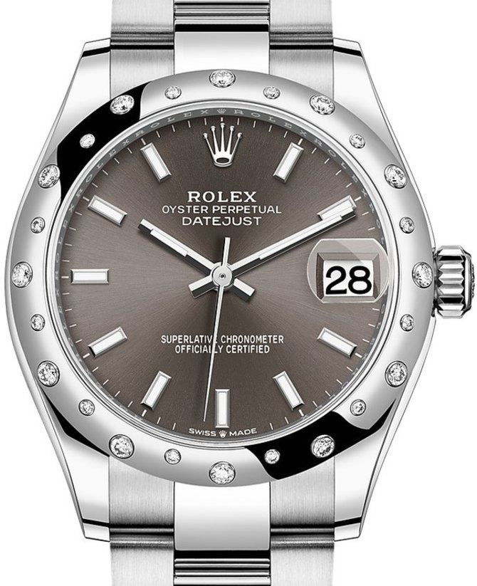 Модель швейцарских часов Datejust 31 Oyster Perpetual 31 mm Ref. 278344RBR-0017 представлена часовым брендом Rolex в 2020 году. Корпус круглой формы произведен из белого золота и нержавеющей стали в диаметре 31 мм. Безель инкрустирован бриллиантами классической огранки разных размеров. На коричневом сатинированном циферблате установлены стрелки из стали и часовая разметка с люминесцентным покрытием. Индикатор даты накрыт фирменной циклопной линзой, которая увеличивает показания данных. Браслет выполнен из нержавеющей стали и дополнен раскладывающейся застежкой. Часовой мануфактурный механизм 2236 отличается надежным запасом хода на 55 часов работы и служит для индикации текущего времени и даты. Лицевое стекло выполнено из натурального сапфирового кристалла с противобликовым составом. Установленный механизм имеет статус хронометра COSC. Герметичность корпуса рассчитана на погружение под воду до 100 метров глубины.