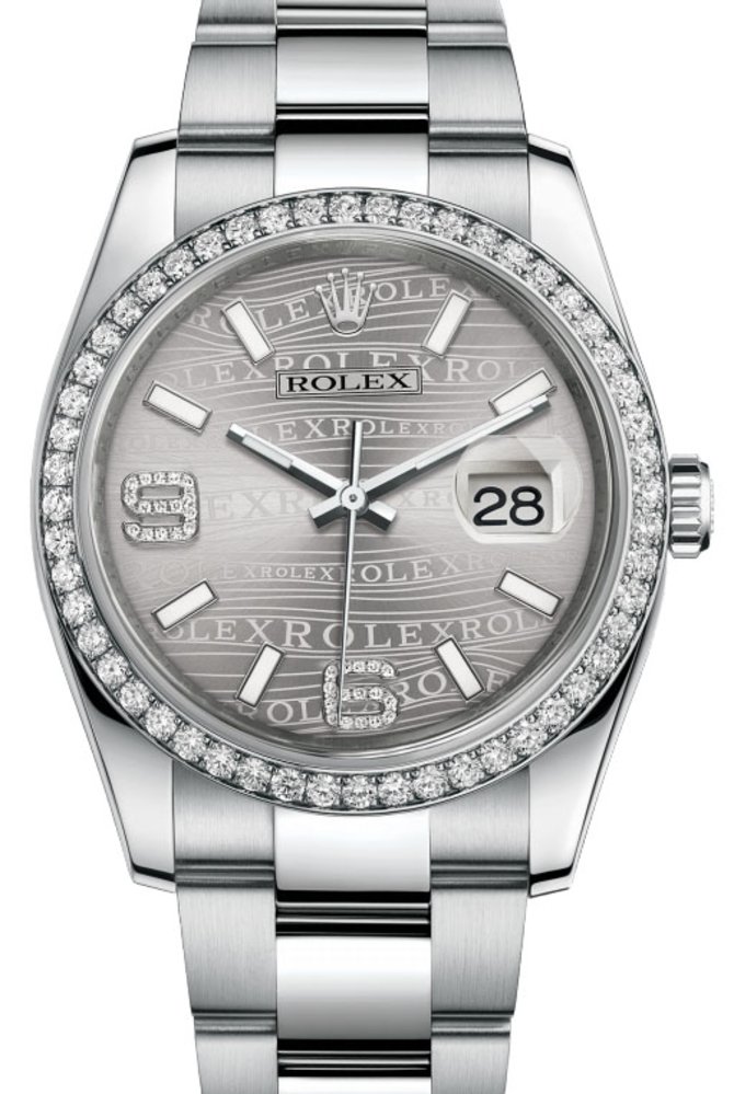 Циферблат – это «лицо» часов, придающее им узнаваемую индивидуальность. На него выводятся показания функций – часы, минуты, секунды, дата, другие значения времени. Представляя собой интерфейс между человеком и часовым механизмом, циферблат объединяет на очень небольшом пространстве всю передаваемую стрелками и указателями информацию и преподносит ее в красивой и хорошо читаемой форме. Создание циферблата можно смело назвать искусством. Лишь редкие часовые компании осуществляют, подобно Rolex, полный цикл производства циферблатов. Перламутр, золото, метеорит и бриллианты – вот лишь некоторые из изысканных материалов, которые позволяют придать великолепие и индивидуальный характер каждому циферблату Rolex. Одни циферблаты прошли пескоструйную обработку, другие покрыты лаком. Рельефные элементы оформления выполнены путем обработки на станке или методом гальванопластики. Накладные часовые отметки – от инкрустированных бриллиантами до люминесцентных, в виде арабских или римских цифр, но обязательно из 18-каратного золота, – закрепляются на циферблате вручную. Самая последняя и самая символичная операция заключается в установке на циферблате накладной короны Rolex. У данной модели циферблат серебристого цвета, узор «волна», белые бриллианты. Безель - бриллианты, 52 белых камня. Закрепка драгоценных камней. Крупные цифры 6 и 9 с бриллиантами. Ювелир, словно скульптор, вырезает в металле каст (оправу) для закрепки бриллианта. Его задача заключается в том, чтобы тщательно позиционировать каждый камень относительно других, а затем надежно закрепить его в золотой или платиновой оправе. Помимо качества самих драгоценных камней, вклад в высокую репутацию ювелирных часов Rolex вносят и другие критерии: расположение камней строго по одной высоте, их позиционирование относительно друг друга, аккуратность и прочность закрепки, гармония пропорций, а также чистовая отделка видимых металлических частей. Сияющая симфония драгоценных камней, облагораживающая часы и зачаровывающа