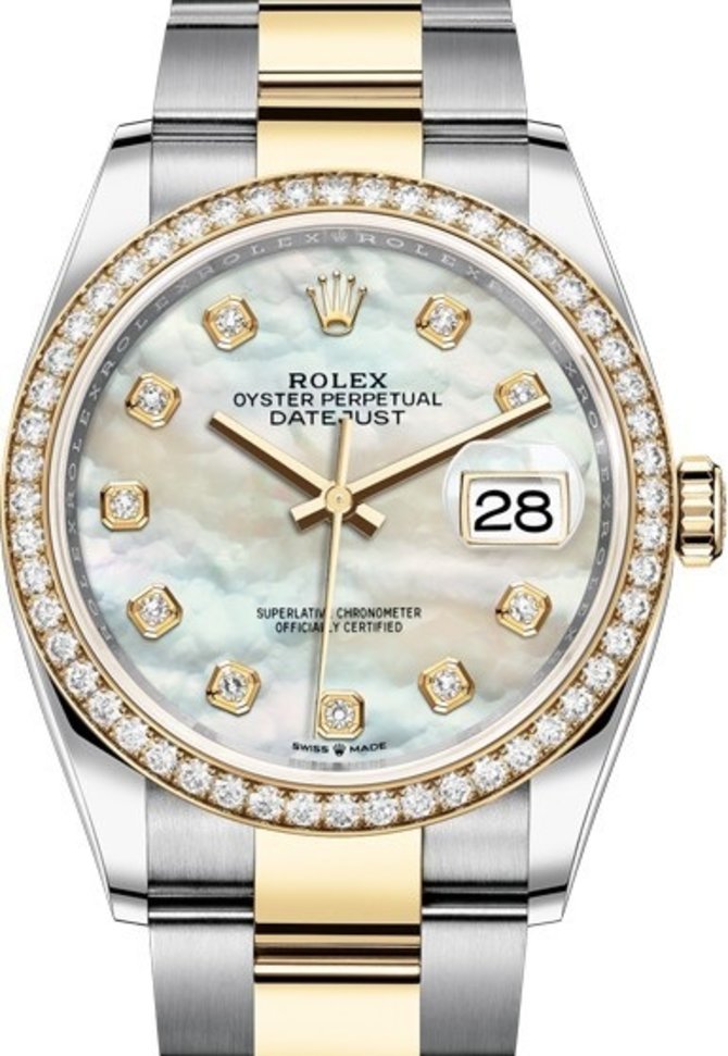 Швейцарская компания Rolex представила свою новую мануфактурную разработку - модель Datejust 36mm Steel and Yellow Gold 126283rbr-0010. На перламутровый циферблат установлены стрелки из золота, часовые метки в виде бриллиантов в золотой основе, индикатор даты с циклопной линзой. Элегантные классические часы оснащены механизмом 3235, выполненным специалистами мануфактуры Rolex. Безель инкрустирован бриллиантами белого цвета классической огранки. Запас хода механизма - 70 часов. Комбинированный браслет с раскладной пряжкой в комплекте поможет закрепить часы на руке.