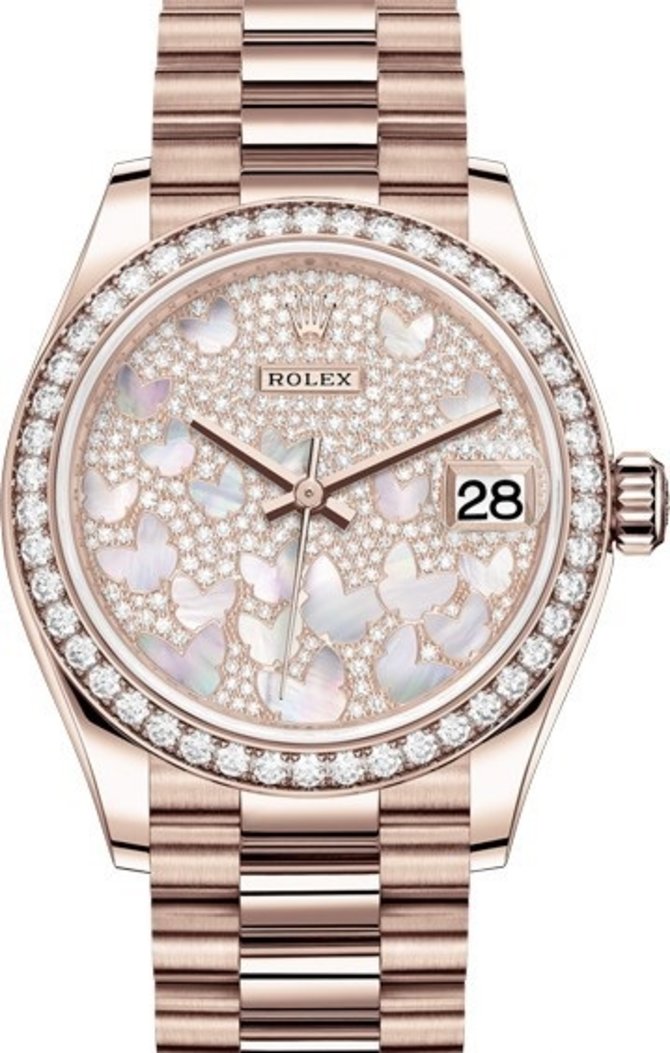 Модель Datejust 31mm Everose Gold 278285rbr-0010 швейцарской марки Rolex функционирует на базе мануфактурного калибра с автоматическим подзаводом и наличием сертификата швейцарского института хронометрии COSC, который подтверждает статус хронометра установленного механизма. Корпус, диаметром 31 мм, а также браслет с раскладной пряжкой выполнены из розового 18-каратного золота. Безель корпуса и циферблат наручных часов украшены белыми бриллиантами классической огранки. Индикатор даты на уровне отметки "3 часа" накрыт увеличительной циклопной линзой. Стрелки произведены из золота. Корпус имеет высокую герметичность - 100 метров.