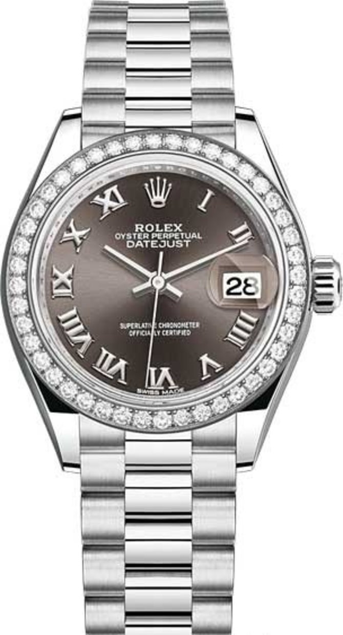 Безель корпуса наручных часов Rolex Datejust Datejust 28 mm Platinum 279136rbr-0010 был декорирован шлифованными алмазами, то есть бриллиантами белого цвета. Часы, минуты, секунды и дата показываются на сатинированном циферблате коричневого цвета, где установлены римские цифры и стрелки из платины, а индикатор даты накрыт стеклом с увеличительным эффектом - циклопной линзой. Внутри платинового 28-миллиметрового корпуса был установлен мануфактурный автоматический калибр от Rolex - 2236, который швейцарский институт хронометрии COSC отметил официальным сертификатом сверхточного хронометра. Корпус имеет 100-метровую водонепроницаемость.