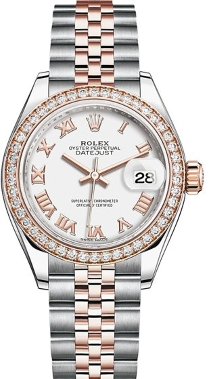 Модель Rolex Datejust 28 mm Steel and Everose Gold 279381rbr-0021 от часовой марки из Швейцарии Rolex обладает комбинированным корпусом из розового золота и стали, диаметром 28 мм. Безель женских швейцарских часов украшен драгоценными камнями - белыми классическими бриллиантами. Римские цифры и стрелки на белом циферблате изготовлены из золота. Циферблат защищается от возможных повреждений сапфировым стеклом. Браслет JUBILEE состоит из стали и розового золота. Он поставляется с раскладной пряжкой. Механизм 2236 с автоподзаводом и сертификатом хронометра COSC отвечает за показания текущего времени и даты. Индикатор даты накрыт увеличивающей показания циклопной линзой. Заводная головка с рифлением и логотипом Rolex сделана из розового золота. Корпус герметичен до 100 метров.
