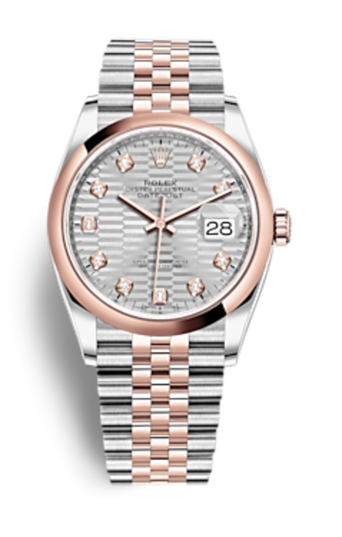 Компания Rolex представляет модель наручных часов DATEJUST 36 m126201-0039 в 36-миллиметровом корпусе из стали и розового золота. Часы работают на базе мануфактурного калибра 3255 с автоподзаводом и запасом хода на 70 часов. Данные текущего времени и даты показываются на гильошированном циферблате серого цвета сквозь защитное стекло из сапфирового кристалла с противобликовым покрытием. Циклопная линза, увеличивающая показания, закрывает индикатор даты. Часовая разметка выложена бриллиантами. Браслет из стали и розового золота фиксируется на запястье с помощью брендовой раскладывающейся застежки. Уровень водонепроницаемости корпуса - до 100 метров.
