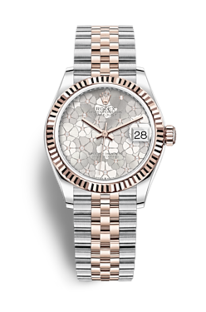 Швейцарские часы от компании Rolex, модель Datejust Oystersteel Everose gold m278271-0032, выпущены в 2022-ом году в круглом корпусе из нержавеющей стали и розового 18-каратного золота, диаметром 31 мм. Модель функционирует на базе мануфактурного механизма Rolex 2236 с автоподзаводом и запасом хода на 55 часов работы без подзавода. Герметичность корпуса рассчитана на погружение до 100 метров глубины. Безель рифленый. Сквозь защитное стекло из натурального сапфирового кристалла с противобликовым покрытием показываются данные текущего времени и даты. Индикатор даты накрыт фирменной и запатентованной Rolex циклопной линзой, которая позволяет считывать данные с увеличивающим эффектом. Раскладная застежка Crownclasp дополняет комбинированный браслет из золота и стали.