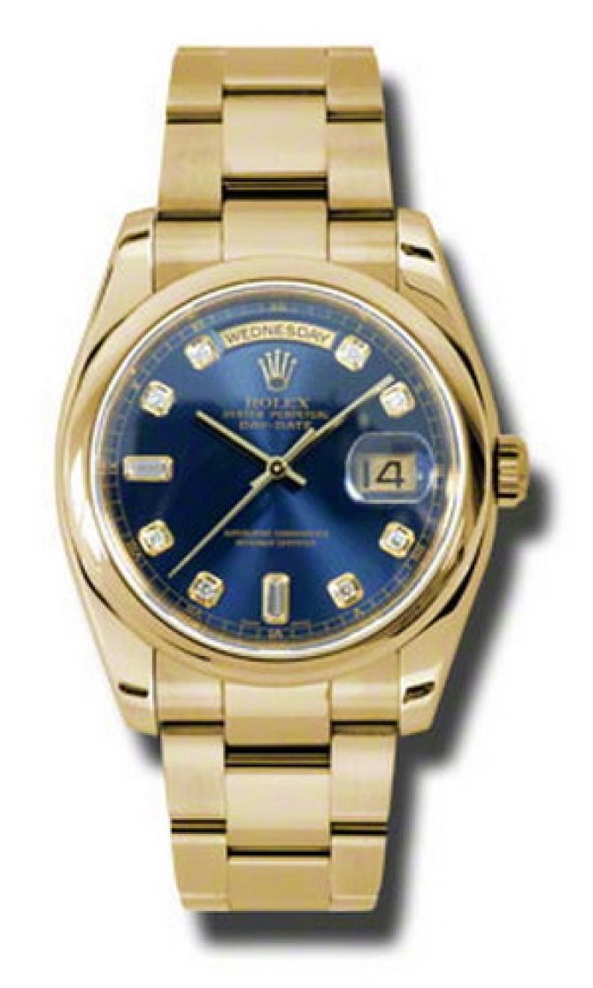 Модель часов Oyster Day-Date воплощает престиж и великолепие часов Rolex. Едва появившись на свет, часы Day-Date сразу же обрели статус часов для влиятельных людей. Модель Day-Date во внушительном корпусе диаметром 36 мм продолжает традиции часов Day-Date. Эти часы выпускаются только в исполнении из платины или золота и предназначены для тех, кто ценит новаторство, достижения и классическую элегантность. Они стали первыми часами, показывающими полное название дней недели. В этой уникальной модели, которую предпочитают мировые лидеры, индикация дней недели в дугообразном окошке осуществляется на многих языках. Дисковый механизм календаря дат и дней недели в полной мере отражает изобретательность своих создателей. Смена дня недели и даты происходит ровно в полночь и практически мгновенно, в соответствии с безупречными стандартами качества Rolex. Часы Rolex уже давно ассоциируются с людьми, которые так или иначе определили ход истории. Несмотря на различия точек зрения, жизненного пути и достижений, есть одна вещь, объединяющая многих из этих удивительных людей: часы Day-Date. На синем циферблате модели размещены 10 белых бриллиантов высокого качества.
