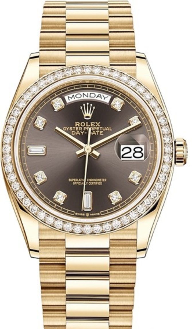 Мануфактурные швейцарские часы Rolex Day-Date 36 mm Yellow Gold 128348rbr-0005 представлены с сатинированным коричневым циферблатом, где установлены стрелки из золота и часовая разметка из белых классических и багетных бриллиантов, а также индикатор даты с циклопной линзой. Часы выполнены в круглом корпусе из желтого золота, диаметром 36 мм, с инкрустацией бриллиантами. Циферблат закрыт стеклом из сапфирового кристалла с антибликовым составом. Корпус оснащен повышенной водонепроницаемостью - 100 метров. Модель работает на базе высокоточного автоматического механизма от компании Rolex с запасом хода на 3 суток и сертификатом хронометра от COSC. Модель укомплектована браслетом PRESIDENT с полукруглыми трехрядными звеньями из желтого золота.