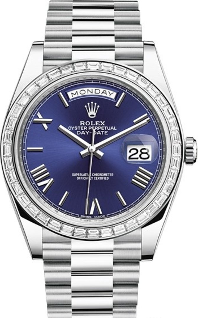 Багетные бриллианты белого цвета украшают круглый безель из платины наручных часов Rolex Day-Date Day-Date 40 mm Platinum 228396tbr-0026. Сатинированный синий циферблат с римскими часовыми метками из платины и стрелками из платины накрыт сапфировым высокопрочным стеклом с противобликовым составом. Индикатор даты оснащен линзой, которую у Rolex называют циклопной. Основная ее задача - увеличить показание даты. Корпус и браслет, которым он укомплектован, изготовлены из платины. Механизм нового поколения сертифицирован COSC как сверхточный хронометр.
