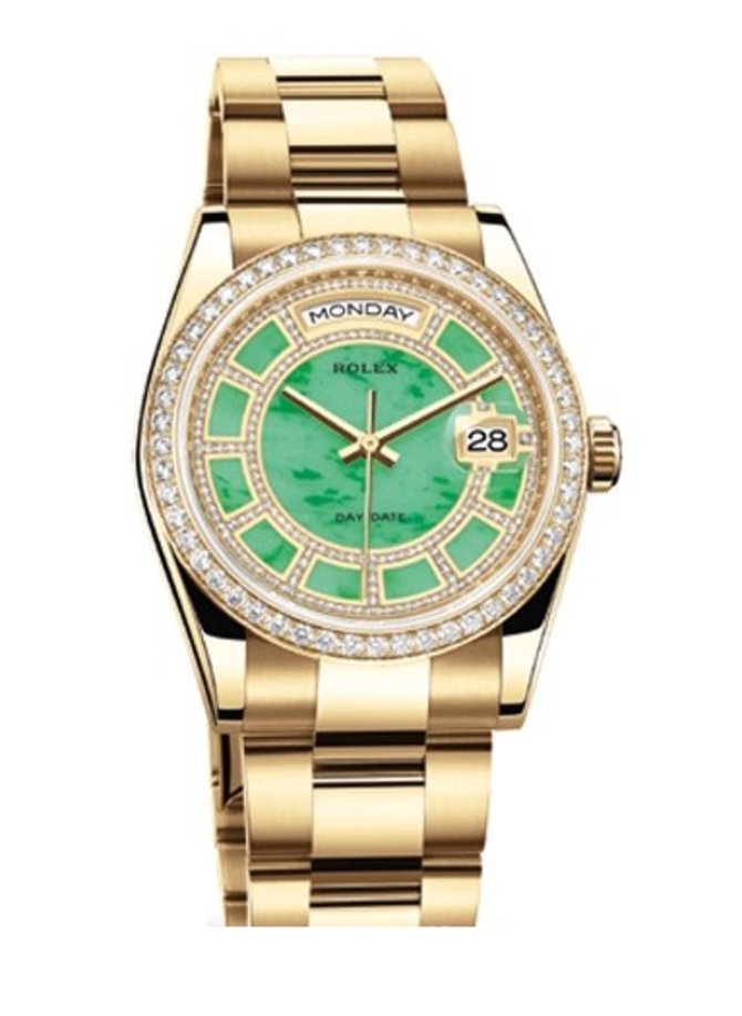Часовая мануфактура Rolex, ассоциирующаяся у любителей часового искусства с надежностью и престижностью, выпустила женские швейцарские часы в корпусе из желтого золота, внутри которого мастера компании установили мануфактурный швейцарский автоматический механизм с таким функциональным набором: часы, минуты, секунды, дата, месяц. Механизм обладает официальным сертификатом хронометра COSC. Также к особенностям этих швейцарских часов можно отнести 100-метровую герметичность корпуса, специальную увеличительную "циклопную" линзу над индикатором даты, 48-часовой запас хода механизма и инкрустацию белыми бриллиантами. Браслет из желтого золота с раскладной застежкой зафиксирует модель на запястье.