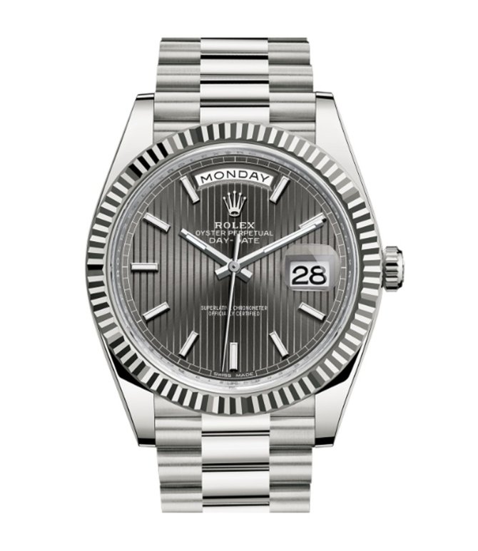 Легендарная швейцарская часовая марка Rolex пополнила коллекцию "Day-Date" новой моделью швейцарских механических часов в корпусе из белого 18-каратного золота со 100-метровой герметичностью, диаметром 40 миллиметров. Внутри золотого корпуса мастерами компании Rolex установлен швейцарский мануфактурный часовой механизм, Калибр 3255, с автоматическим подзаводом и 70-часовым запасом хода. Мануфактурный Калибр 3255 обладает сертификатом швейцарского хронометра COSC. Это означает, что механизм успешно прошел все тестирования в Официальном Швейцарском Институте Хронометрии. На сером гильошированном циферблате отображается такой набор функций: часы, минуты, секунды, дата, день недели. Дата отображается через брендовую, всемирно известную циклопную линзу. К руке владельца часы крепятся браслетом из белого золота с раскладывающейся фирменной застежкой.