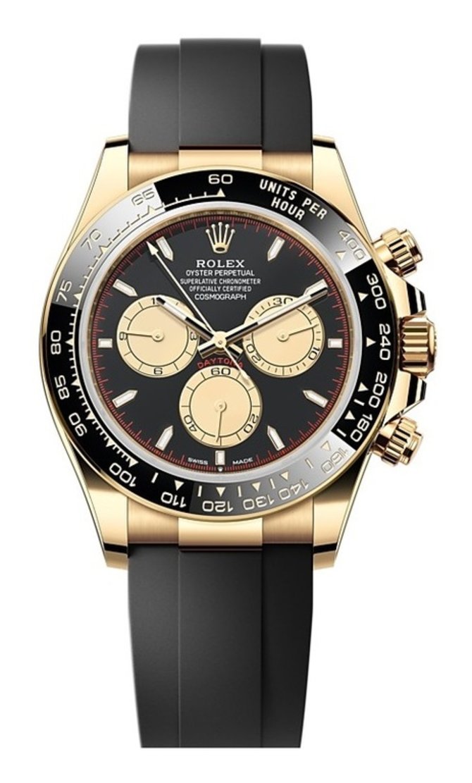 Мужские швейцарские часы с функцией хронографа от компании Rolex, модель Cosmograph Daytona 40mm Yellow Gold 126518ln-0004, представлены в круглом корпусе из желтого золота. На запястье руки часы фиксируются каучуковым ремешком с застежкой из желтого золота. Под стеклом из сапфирового кристалла с антибликовым покрытием показываются часы, минуты, секунды, данные хронографа. На керамическом безеле расположена тахиметрическая шкала. Стрелки и часовые метки покрыты люминесцентным составом, который светится в темноте. Установленный мануфактурный механизм 4130 с автоматическим подзаводом отличается запасом хода на 72 часа работы без подзавода, а также сертификатом хронометрической точности хода. Водонепроницаемость корпуса - 100 метров. Модель Cosmograph Daytona 40 mm Yellow Gold 126518ln-0012 выпущена мануфактурой Rolex в 2023 году.
