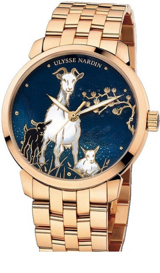 Рисунок на циферблате - восьмой знак Китайского гороскопа - коза. Ограниченная линия из 88 экземпляров. Циферблат ручной работы. Механизм UN-815 с автоподзаводом, COSC-сертифицированный. 42-часовой запаса хода. Водонепроницаемость корпуса до 50 метров. Лаконичный и элегантный дизайн, удобство использования дополнительных функций, практичность и в то же время элитарность материалов все это характеризует часы легендарной швейцарской компании Ulysse Nardin. В некоторых моделях серии как бы приоткрыта завеса тайны над механизмом часов. Нет в часовом мире большей похвалы, чем назвать механизм мануфактурным. Это означает, что он полностью сконструирован, изготовлен и собран силами одного предприятия мануфактуры. Часы Ulysse Nardin отлично подойдут людям уверенным в себе, успешным, предпочитающим самое высокое качество и непревзойденное исполнение. Эти часы по праву можно назвать произведением часового искусства. На судне главное – это его сплоченная команда, точная, как часы; в часах слаженная безукоризненная команда механизмов. Эта двойная историческая и концептуальная общность и стала естественным поводом для появления яхтенных коллекций от ведущих часовых ателье.
