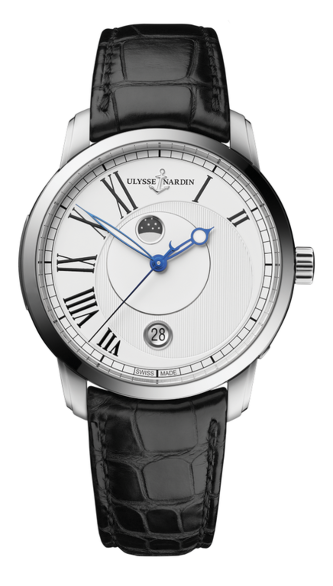 Астрономические швейцарские часы от компании Ulysse Nardin выполнены с соблюдением всех классических часовых традиций. Круглый корпус, диаметром 40 миллиметров, произведен из качественной нержавеющей стали. На циферблате указываются: часы, минуты, секунды, дата и фазы Луны. В представленной модели установлен калибр UN-829, который работает от автоматического подзавода. Механизм имеет официальный сертификат хронометра, выданный швейцарским институтом хронометрии COSC. Герметичность корпуса часов - 50 метров. Циферблат оберегает натуральное сапфировое стекло. Часы укомплектованы ремешком из кожи крокодила с классической застежкой, соответствующей материалу корпуса. Заводная головка завинчивающаяся.