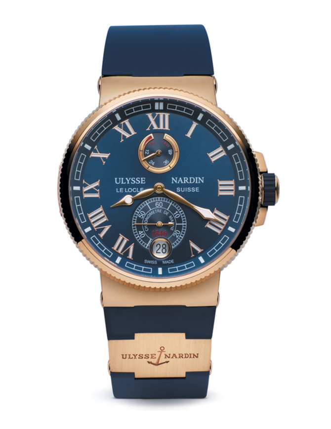 Швейцарский механический хронометр, официально сертифицированный COSC (институт хронометрии), представленный знаменитым брендом Ulysse Nardin в круглом 43-миллиметровом корпусе из 18-каратного розового золота со 100-метровой герметичностью. Внутри водостойкого корпуса установлен мануфактурный калибр UN-118 с автоподзаводом, обладающий 60-часовым запасом хода, индикатор которого расположен на основном циферблате. Кроме уровня запаса хода, на циферблате также индицируются часы, минуты, секунды и дата. Индикация секунд осуществляется на отдельном субциферблате выше отметки "6 часов" и окошка даты. Уровень безопасности повышает качественная завинчивающаяся заводная головка. Циферблат защищен прочным сапфировым стеклом. Каучуковый ремешок, которым укомплектована данная модель швейцарских часов Ulysse Nardin, дополнен двумя вставками из розового золота - пластиной с эмблемой марки Ulysse Nardin и раскладывающейся застежкой для фиксации часов на руке.
