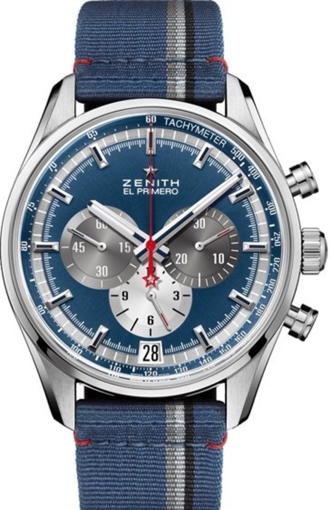 Стильная модель спортивных швейцарских часов Zenith Chronomaster El Primero - 42.00 03.2040.400/53.C802 выпущена в круглом 42-миллиметровый корпусе из высококачественной стали. Циферблат служит для индикации времени, даты, показаний хронографа. Установленный калибр El Primero 400 B работает от автоподзавода. Он наделен функцией хронографа и запасом хода на 50 часов работы. Матерчатый ремешок синего цвета пошит из нейлона. Циферблат накрыт сапфировым стеклом с противобликовым эффектом. Корпус со 100-метровой водостойкостью.