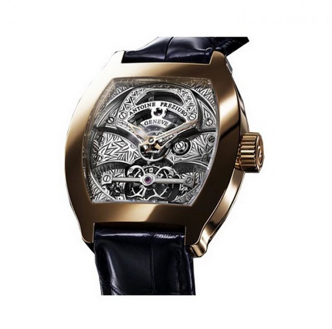 Наручные часы от швейцарской часовой мануфактуры Antoine Preziuso, The Art of Tourbillon, в корпусе бочкообразной формы из розового золота выпущены ограниченной серией из 10 экземпляров. На скелетонизированном гильошированном циферблате индикацию часов и минут обеспечивает мануфактурный швейцарский механический механизм с ручным подзаводом. Размеры корпуса: 42 миллиметра - диаметр; 12 миллиметров - толщина. Герметичность корпуса - 30 метров. К запястью часы крепятся с помощью ремешка из крокодильей кожи с раскладывающейся застежкой. Скоро купить часы A. Preeziuso можно будет в часовых бутиках по всему миру. В дальнейших планах развития часовой марки Antoine Preizuso, наряду с расширением производства, на повестке дня стоит открытие фирменных часовых бутиков на всех 5 - ти континентах.